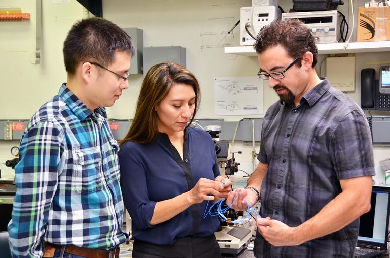 Keywords: Los investigadores de IBM Research Chi Xiong, Norma Sosa y Will Green preparan una prueba de sensores en el laboratorio. Copyright: IBM Research