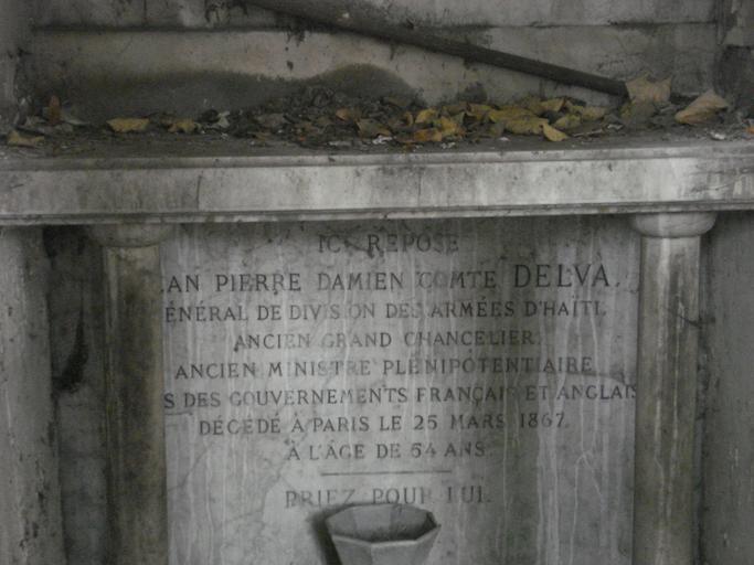| Keywords: Sépulture du général comte Jean-Pierre-Damien DELVA (Haïti) - Cimetière Montmartre.jpeg DELVA Jean-Pierre-Damien Comte de DELVA 1803-1867 général de division des armées d ™Haïti ministre plénipotentiaire des gouvernements français et anglais né à Haïti décédé le 25 mars 1867 à Paris Il est le fils du général Jean-Baptiste Delva et de Marie-Louise Eunomine Daran Il a épousé en 1ère noce Louise-Émilie-Émelina Morisset fille du général Alexandre Morisset et de Lise Thébaud le 9 septembre 1833 à Port au Prince Il est le grand-père de la poétesse https //fr wikipedia org/wiki/Ida_Faubert Ida Faubert En 2e noce Damien Delva épouse Marie-Madeleine-Laure Vernard qui repose dans la chapelle du cimetière de Montmartre Il décède le 26 mars 1867 à Paris 8e 88 boulevard Malesherbes http //canadp-archivesenligne paris fr/archives_etat_civil/1860_1902_actes/aec_visu_img php registre V4E_00928 type AEC bdd_en_cours actes_ec_1860_1870 vue_tranche_debut AD075EC_V4E_00928_0067 vue_tranche_fin AD075EC_V4E_00928_0067 ref_histo 10015 cote V4E 20928 acte n° 489 La chapelle est dans la 1ère division face au monument de la famille d'Haubersart qui touche le mur d'enceinte Å“uvre personnelle 2014-06-14 maixentais Cimetière de Montmartre Cc-zero |