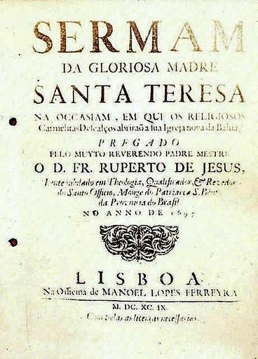 Keywords: Sermão da Gloriosa Madre Santa Teresa.JPG pt Frontispício do Sermão com que se abriu a igreja de Santa Teresa de Salvador Bahia aos fiéis em 15 de outubro de 1697 Pregou-o o frei beneditino Ruperto de Jesus -1708 primeiro brasileiro a doutorar-se pela Universidade de Coimbra Scan from MAIA Pedro Moacir Museu de Arte Sacra/UFBA São Paulo Banco Safra 1987 Workshop of Manoel Lopes Ferreyra Lisboa Portugal 1697 PD-old-100 Sermons 1697 books Museu de Arte Sacra da Bahia Roman Catholicism in Brazil |