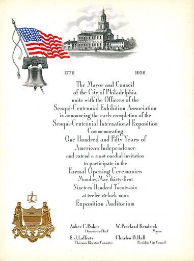 | Keywords: Sesqui-Centennial Invitation.jpg  Engraved invitation to the Opening Ceremonies for the 1926 Sesqui-Centennial Exposition at Philadelphia Pa May 31 1926 Courtesy of the Bruce C Cooper Collection en wikipedia Stevenliuyi CommonsHelper 2008-03-25 Centpacrr wikipedia en Centpacrr March 2008 original upload log page en wikipedia Sesqui-Centennial_Invitation jpg 2008-03-25 10 42 Centpacrr 1106×1486× 334736 bytes <nowiki>Engraved invitation to the Opening Ceremonies for the 1926 Sesqui-Centennial Exposition at Philadelphia Pa May 31 1926 License information Centpacrr </nowiki> Sesquicentennial Exposition |