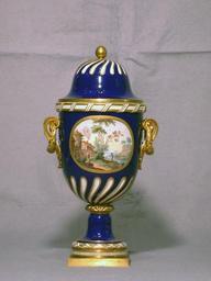 | Keywords: Sèvres Porcelain Manufactory - One of a Pair of Vases (Vase à feuilles de laurier) - Walters 48626 - Back.jpg Walters Art Museum artwork Creator Manufacture nationale de Sèvres This vase and its pair Walters 48 625 are in bleu nouveau and have handles in the form of rings of laurel leaves The vases are decorated with panels showing amorous shepherds and shepherdesses Pithou the elder painted these scenes after Francois Boucher's paintings La Musique pastorale and Les Amusements de la campagne 1743 1772 soft-paste porcelain cm 32 6 accession number 48 626 38481 Collection of Sir Anthony Rothschild according to Hodgkins remains to be verified E M Hodgkins Collection Paris no 51 date and mode of acquisition unknown A Seligmann Rey and Co New York Henry Walters city Baltimore Walters Art Museum Henry Walters Acquired by Henry Walters 1928 Factory Mark Intertwined Lls; Date Letters T 1772 ; Modeler's Mark Incised in the glaze PT initials could refer to either Pierre-Edmond Tristant aîné c 1741-1788 a turner repairer and sculptor of soft and hard paste; or Philibert Choulet aîné op 1756-1779 a turner and possibly repairer of soft and hard paste place of origin Sèvres France Walters Art Museum license Sèvres porcelain in the Walters Art Museum Charles-Nicolas Dodin Nicolas-Pierre Pithou |