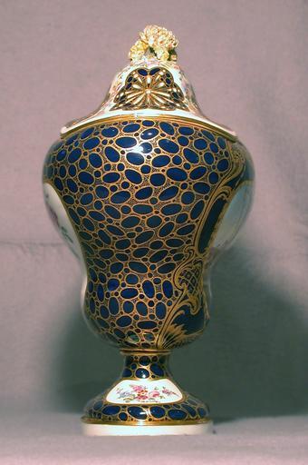| Keywords: Sèvres Porcelain Manufactory - Potpourri Vase (Vase potpourri Hébert) - Walters 48577 - Profile.jpg The model for this vase still preserved at the Sèvre manufactory is labeled vase à cartels modèle de Hébert T J Hébert was an 18th-century art dealer The harbor scene is by J L Morin The bleu lapis ground color has been gilded in a caillouté or pebbled pattern between 1760 1765 soft-paste porcelain cm 35 5 accession number 48 577 6202 E M Hodgkins Collection Paris no 24 date and mode of acquisition unknown A Seligmann Rey and Co New York Henry Walters city Baltimore Walters Art Museum Henry Walters Acquired by Henry Walters Modeler's Mark Impressed in base cn possibly for Charles Cejourné répareur and sculptor place of origin Sèvres France Walters Art Museum license Sèvres porcelain in the Walters Art Museum Potpourri vases Jean-Louis Morin |