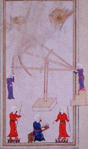| Keywords: Sextant TakiyüddinRasid TopkapiPalaceMuseum.jpg en Depiction of the en sextant used in astronomy and astrology by the Ottoman Observatory in Istanbul and by the office of müneccimbaşı chief astrologer in the 16-17th centuries http //www muslimheritage com/topics/default cfm ArticleID 949 From Al-âlât al rasadiya li-zij al-shahinshahiyya by en Taqi al-Din Muhammad ibn Ma'ruf Library of the en Topkapi Palace Museum Hazine 452 fol 14b second half of the 16th century published in several works treating science in Turkish and/or Islamic history PD-old Astronomy in medieval miniatures Astronomy in Turkey Uploads by User Cretanforever Turkish Illuminated manuscripts in the Topkapi Palace Museum Istanbul Observatory Islamic sextant |