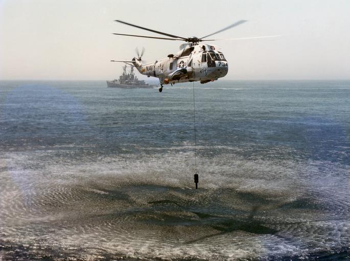 | Keywords: SH-3H Sea King of HS-6 lowering sonar c1977.jpg A U S Navy Sikorsky SH-3H Sea King of Helicopter Ant-Submarine Squadron HS-6 Indians out of Naval Air Station North Island California USA is shown lowering its AQS-13 sonar into the water HS-6 was assigned to Carrier Air Wing 9 CVW-9 aboard the aircraft carrier USS Constellation CV-64 The guided missile destroyer USS John S McCain DDG-36 is visible in the background http //collections naval aviation museum/emuwebdoncoms/pages/doncoms/AdvQuery php U S Navy National Museum of Naval Aviation photo No http //collections naval aviation museum/emuwebdoncoms/pages/doncoms/Display php irn 58813 QueryPage 2Femuwebdoncoms 2Fpages 2Fdoncoms 2FAdvQuery php 2011 003 323 020 ca 1977 U S Navy PD-USGov-Military-Navy SH-3H Sea King Helicopter Anti-Submarine Squadron 6 United States Navy AN/AQS-13 USS John S McCain DDG-36 |