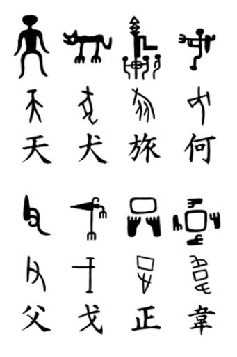 | Keywords: Shang Bronze and Oracle Script.png en Comparison between late Shang bronzeware characters and oracle bone script characters <b>天</b> full-frontal depiction of a man 大 with big head - 'heaven' 'sky' <b>犬</b> 'dog' <b>旅</b> people 人 under a banner 㫃 - 'troop' 'to journey' <b>何</b> man 人 carrying a halberd 戈 - interrogative pronoun <b>父</b> hand 又 holding a stone ax 丨 - 'father' <b>戈</b> 'halberd' <b>正</b> phonetic 丁 + semantic 止 - 'straight'; 'right'; 'proper'; 'to correct' and <b>韋</b> footsteps 止 around an enclosure 口 - 'tanned leather' own ; character drawings modelled on actual surviving examples as found in http //humanum arts cuhk edu hk/Lexis/lexi-mf/ http //www chineseetymology org/ and http //www shufazidian com/ Pat457 2016-11-03 PD-ancient-script Chinese characters Oracle bone script Bronze script Oracle bone script characters Bronze script characters Regular script Shang Dynasty Cc-zero |