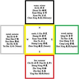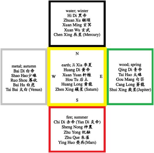 Keywords: Shangdi-Huangdi religious cosmology.png Chinese traditional religious cosmology of the Wǔfāng Shàngdì 五方上 Five Forms of the Highest Deity with the Yellow Deity the Four-Faced God at the centre of the universe emanating the other four cosmological deities of directions and seasons Own reproduction of the scheme found at p 121 of The Chinese Sky During the Han Constellating Stars and Society 1997 by Xiaochun Sun and Jacob Kistemaker 23-2015 Aethelwolf Emsworth Confucianism Chinese folk religion |
