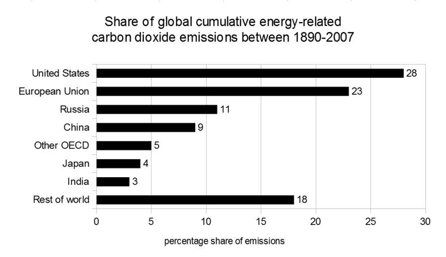| Keywords: Share of global cumulative energy-related carbon dioxide emissions for major emitters between 1890-2007.png carbon dioxide emissions between 1890-2007 Major emitters are shown percentage share in brackets the United States 28 the European Union 23 Russia 11 China 9 other OECD countries 5 Japan 4 India 3 and the rest of the world 18 Data are from IEA 2009 For more information see greenhouse gas <br/><br/>References IEA 2009 http //www worldenergyoutlook org/media/weowebsite/2009/WEO2009 pdf World Energy Outlook 2009 p 180 p 182 of PDF http //www iea org/ International Energy Agency IEA Paris France ISBN 978-92-64-06130-9 own Enescot 2012-10-28 Global warming graphs Atmospheric carbon dioxide Cc-zero |