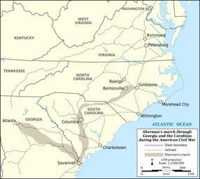 | Keywords: Shermans march through Georgia and the Carolinas map-en.svg validSVG 35 00 00 N 80 00 00 W scale 3000000 <br/> Map of Gen William T Sherman's march through Georgia and the Carolinas during the American Civil War Carte de la marche du général William Tecumseh Sherman à travers la Géorgie et les Carolines durant la Guerre de Sécession <br/> UTM projection<br/> Scale 1 2 000 000 Own <br/> http //www cr nps gov/nr/twhp/wwwlps/lessons/69bentonville/69locate1 htm US National Park Service's map<br/> NGDC World Data Bank II<br/> VMap-0 2009-07 Eric Gaba Sting - fr Sting Public domain Other_versions/Shermans_march_through_Georgia_and_the_Carolinas_map Atelier graphique carte translation possible fr French Wikipedia Sting Battle of Atlanta Battle of Bentonville Georgia in the American Civil War Maps of Sherman's March to the Sea North Carolina in the American Civil War South Carolina in the American Civil War William Tecumseh Sherman |