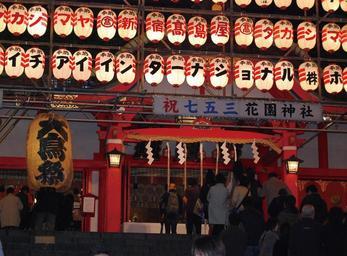 Keywords: Shinto worships at Cock Festival of Hanazono Shrine in Japan.jpg en Shinto worships at Cock Festival of Hanazono Shrine in Japan ja 酉の市の花 神社 殿前 Own Kstigarbha 2007-11-10 Hanazono-jinja Paper lanterns in Japan