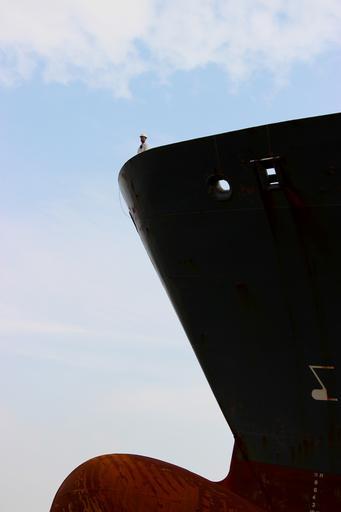 Keywords: ship freighter bug gigantic sky big and small man on boat lock brunsbüttel germany