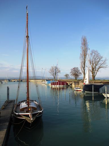 Keywords: ship sailing vessel einmaster beautiful wooden mast boat harbour lake constance romanshorn switzerland