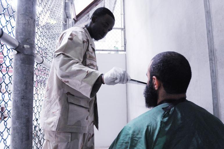 | Keywords: Ship’s Serviceman 3rd Class Darold Johnsonbrown combs a detainee’s beard in Camp VI DVIDS367055.jpg en Petty Officer 3rd Class Darold Johnsonbrown ship's serviceman combs a detainee ™s beard in Camp VI Feb 10 Johnsonbrown is attached to the Navy Expeditionary Guard Battalion which provides a portion of the guard force inside the detention facilities Traditionally in the Navy Ship ™s Serviceman manages the ship ™s barber shop laundry dry cleaning and tailor departments 2011-02-10 Petty Officer 1st Class David P Coleman https //www dvidshub net/image/367055 110210-N-+++++-086 2011-02-14 12 23 GUANTANAMO BAY CU PD-USGov-Military-Navy Guantanamo Bay Images from DoD uploaded by Fæ |
