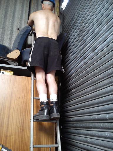 Keywords: worker working shirtless topless work boots workboots hard hat hardhat shorts ladders hse health safety ppe Worker wearing blue hard hat, black shorts and workboots climbs ladder to fix warehouse door Worker wearing blue hard hat, black shorts and workboots climbs ladder to fix warehouse door |