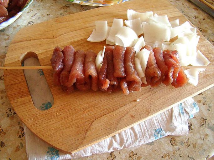 Keywords: shish kebab meat onion slicing cocktail stick skewer board cutting board