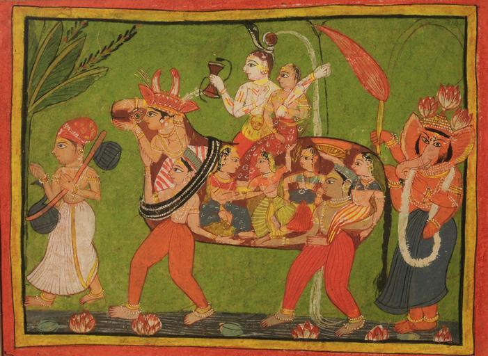 | Keywords: Shiva and Parvati on a composite cow made of assembled women - Unknown, Rajasthan School - Google Cultural Institute.jpg A man playing a musical instrument leads the procession followed by Shiva and Parvati seated on a cow Four-armed Ganesh follows them with a fly-whisk attending the royal couple This narikunjan composite creature made of assembled women is very typical of Indian art Miniature Painting by unknown artist Rajasthan School Natural pigment on paper 18 X 25 cm 1775 - 1800 https //www google com/culturalinstitute/asset-viewer/shiva-and-parvati-on-a-composite-cow-made-of-assembled-women/3wFCTKnk6EKPJg PD-Art-100 Paintings of Shiva and Parvati Files uploaded by Yann Forget Paintings from Rajasthan Google Art Project works by unknown artist India 18th-century paintings from India Academy of Fine Arts and Literature |
