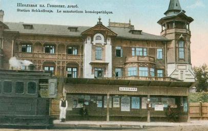 Keywords: Shkolnaya colour postcard.jpg Железнодо ожная станция Школьная на до еволюционной отк ытке Railway station Shkolnaya in pre-revolutionary card http //www nlr ru/exib/railway/images/1shkolnaya jpg nlr ru s 1900 Unknown publisher PD-Old Shkolnaya railway station Postcards of Saint Petersburg