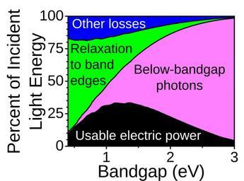 | Keywords: ShockleyQueisserBreakdown2.svg en The Shockley-Queisser limit for the maximum possible efficiency of a solar cell black and the inevitable losses that limit it other colors The black height is energy that can be extracted as useful electrical power; the pink height is energy of below-bandgap photons; the green height is energy lost when hot photogenerated electrons and holes relax to the band edges; the blue height is energy lost in the tradeoff between low radiative recombination versus high operating voltage The curves are all wiggly because of IR absorption bands in the atmosphere I used the actual AM1 5G solar spectrum data I cross-checked the black curve with independently-calculated ones and they agree to high accuracy http //www opticsinfobase org/abstract cfm URI OSE-2010-SWA1 http //www opticsinfobase org/abstract cfm URI OSE-2010-SWC4 The other curves besides the black curve are not published in exactly this form to my knowledge but it's a straightforward part of the same calculation own Sbyrnes321 2011-02-17 ShockleyQueisserBreakdown2 DE svg The data-file for this graph is freely available ask me at http //en wikipedia org/wiki/User_talk Sbyrnes321 I did the calculation in Mathematica the plotting in Origin and the PDF-->SVG conversion in Inkscape The Mathematica source code is posted on my website http //sjbyrnes com/ Cc-zero Photovoltaic power schemas and diagrams Solar cell schemas and diagrams |