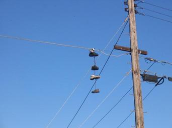 Keywords: Shoes On Power Line.JPG 2005-03-16 own assumed Indolences Low-voltage overhead power lines Shoes hanging from overhead wires Taken with Canon PowerShot A60