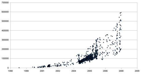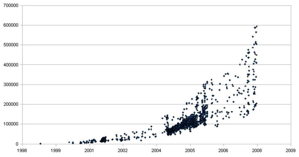 Keywords: ShoutcastListenerGrowth.png en wikipedia 2012 July 16 Growth in number of concurrent listeners connected to stations at shoutcast com from April 17 1999 to February 14 2008 The data source is self-reported statistics on shoutcast com's front page collected using the Internet Archive's Wayback Machine at http //web archive org/web/ /http //shoutcast com This work is entirely my own built using Openoffice org Calc and Draw I relinquish any and all copyright claims I might have releasing the work into the public domain Data file in CSV format <pre> Date Listeners Servers 4/17/1999 1367 410 4/18/1999 1315 436 6/21/2000 8633 1268 8/15/2000 4206 1217 8/15/2000 8397 1233 12/3/2000 3850 1250 12/5/2000 9004 1348 12/16/2000 5180 1449 12/19/2000 5076 1370 1/19/2001 11904 1642 2/2/2001 7297 1501 2/5/2001 5903 1411 2/24/2001 6705 1524 3/1/2001 5861 1467 3/2/2001 6434 1461 3/8/2001 13622 1599 3/31/2001 7476 1684 4/5/2001 8265 1755 4/18/2001 17401 2009 5/7/2001 7319 1722 5/13/2001 7063 1702 5/15/2001 16761 1817 5/19/2001 8891 1743 5/20/2001 8604 1821 5/22/2001 9528 1861 5/22/2001 9528 1861 5/28/2001 11578 2053 5/29/2001 8263 1837 5/31/2001 10288 1826 5/31/2001 18858 1842 6/2/2001 7639 1785 6/15/2001 17513 2115 6/21/2001 21852 2038 6/27/2001 17456 1958 6/27/2001 17855 1845 6/29/2001 20962 1989 7/10/2001 18617 2140 7/13/2001 10899 1912 7/20/2001 11454 1836 9/26/2001 13448 2086 10/9/2001 15034 2138 10/10/2001 15735 2146 10/11/2001 17653 2159 10/12/2001 15840 2173 10/13/2001 11645 2077 10/14/2001 11063 2067 10/15/2001 12808 2102 10/23/2001 25519 2272 10/24/2001 23725 2255 10/25/2001 24516 2274 10/26/2001 23463 2333 10/27/2001 13794 2250 10/30/2001 29106 2399 10/31/2001 29206 2349 11/1/2001 20323 2289 11/2/2001 12376 2311 11/2/2001 23313 2308 11/3/2001 16137 2335 11/4/2001 13528 2317 11/4/2001 13879 2475 11/5/2001 13699 2309 11/5/2001 20524 2329 11/6/2001 16829 2330 11/6/2001 30378 2457 11/6/2001 30544 2393 11/7/2001 18729 2335 11/7/2001 20337 2366 11/9/2001 16794 2385 11/9/2001 30322 2483 11/10/2001 17071 2432 11/10/2001 17071 2432 11/11/2001 13999 2397 11/12/2001 13764 2256 11/12/2001 20414 2303 11/13/2001 29841 2423 11/13/2001 29200 2440 11/14/2001 18257 2345 11/14/2001 24834 2352 11/15/2001 21738 2345 11/17/2001 15450 2434 11/19/2001 31114 2527 11/20/2001 18609 2428 11/21/2001 17392 2400 11/21/2001 13610 2435 11/22/2001 15670 2450 11/22/2001 14596 2469 11/24/2001 14357 2420 11/24/2001 14425 2712 11/25/2001 13587 2557 11/26/2001 21816 2480 11/29/2001 19448 2546 12/1/2001 10961 2546 12/1/2001 15235 2443 12/2/2001 10280 2447 12/2/2001 15471 2369 12/3/2001 29051 2466 12/4/2001 32109 2533 12/5/2001 32098 2546 12/6/2001 32699 2625 12/7/2001 27273 2615 12/8/2001 18242 2551 12/9/2001 16681 2440 12/10/2001 31512 2596 12/11/2001 17400 2543 12/12/2001 17787 2533 12/13/2001 21271 2601 12/14/2001 19281 2614 12/15/2001 17169 2621 12/16/2001 15387 2530 12/17/2001 34606 2613 1/20/2002 17663 2611 1/24/2002 16606 2593 3/26/2002 22440 3231 4/2/2002 23160 2752 5/24/2002 45271 3146 5/25/2002 25233 3092 5/28/2002 37725 3029 6/4/2002 24655 3000 6/6/2002 20678 2921 7/21/2002 21736 2755 7/26/2002 21120 2662 8/2/2002 39931 2842 8/3/2002 15874 2624 8/4/2002 15419 2584 8/5/2002 21997 2609 8/7/2002 24585 2756 8/8/2002 20744 2742 8/8/2002 23465 2732 8/9/2002 25496 2773 8/10/2002 18323 2759 8/11/2002 19220 2681 8/13/2002 24627 2740 8/13/2002 22817 2719 8/14/2002 30210 2797 8/15/2002 22176 2761 8/16/2002 31592 2851 8/22/2002 20431 2786 9/23/2002 31477 2829 9/25/2002 51319 3089 9/28/2002 20462 2850 9/30/2002 22881 2850 10/17/2002 46049 3252 10/28/2002 21910 3020 11/21/2002 28013 3177 11/22/2002 36797 3288 11/24/2002 25888 3294 11/29/2002 31515 3401 12/1/2002 21428 3104 1/22/2003 60426 3659 2/17/2003 52815 3783 2/18/2003 34776 3714 3/19/2003 59817 4093 3/23/2003 28691 3918 4/4/2003 35169 3756 4/22/2003 33302 3529 5/25/2003 18574 3742 6/11/2003 36541 3854 6/12/2003 39430 3883 6/12/2003 51022 3978 6/23/2003 61312 4317 7/26/2003 32622 3749 7/29/2003 56696 4007 9/19/2003 74377 4360 10/5/2003 34060 4252 10/24/2003 73531 4641 10/28/2003 88804 4676 11/20/2003 48789 4620 12/4/2003 46259 4721 12/25/2003 36392 4646 12/30/2003 50202 4704 1/1/2004 39402 4881 4/7/2004 128863 6496 4/11/2004 56199 6070 5/9/2004 61639 6223 5/13/2004 98383 6473 5/19/2004 139798 6739 5/26/2004 71073 6170 6/5/2004 88934 6696 6/6/2004 70347 6506 6/9/2004 86097 6253 6/10/2004 71709 6272 6/10/2004 132417 6727 6/11/2004 134012 6867 6/12/2004 75283 6422 6/14/2004 123395 6598 6/14/2004 131475 6712 6/15/2004 62380 6177 6/15/2004 74649 6172 6/16/2004 75481 6140 6/16/2004 135806 6649 6/18/2004 72640 6299 6/18/2004 133807 6965 6/19/2004 70140 6554 6/19/2004 62846 6264 6/21/2004 108698 6658 6/22/2004 70166 6396 6/22/2004 77081 6369 6/22/2004 143941 6943 6/23/2004 72696 6393 6/23/2004 82796 6383 6/24/2004 138699 6795 6/26/2004 51969 6310 6/26/2004 59117 6335 6/26/2004 62977 6392 6/27/2004 48767 6149 6/27/2004 52285 6177 6/28/2004 59731 6252 6/28/2004 67223 6193 6/29/2004 72640 6183 6/30/2004 79265 6216 6/30/2004 132880 6678 7/1/2004 74497 6164 7/1/2004 86750 6368 7/1/2004 130309 6693 7/1/2004 103760 6551 7/2/2004 94443 6683 7/3/2004 59586 6373 7/3/2004 54244 6237 7/4/2004 44353 6223 7/4/2004 46654 6187 7/5/2004 47826 6225 7/5/2004 64928 6125 7/6/2004 60927 6317 7/6/2004 67313 6168 7/7/2004 70134 6264 7/8/2004 62969 6227 7/10/2004 55929 6340 7/10/2004 58683 6263 7/10/2004 64627 6391 7/10/2004 75451 6667 7/11/2004 53419 6254 7/11/2004 54923 6155 7/12/2004 55321 6218 7/12/2004 69209 6249 7/13/2004 70396 6330 7/13/2004 66197 6135 7/14/2004 56047 6280 7/14/2004 70382 6243 7/15/2004 60394 6184 7/15/2004 77410 6173 7/16/2004 63082 6325 7/16/2004 72269 6204 7/17/2004 56885 6383 7/17/2004 56441 6328 7/18/2004 49600 6156 7/18/2004 48936 6098 7/19/2004 61502 6252 7/19/2004 64181 6188 7/20/2004 72327 6385 7/20/2004 65444 6197 7/21/2004 70139 6398 7/21/2004 73078 6290 7/22/2004 71014 6480 7/22/2004 71892 6378 7/24/2004 55532 6354 7/24/2004 60037 6368 7/25/2004 53881 6339 7/26/2004 60485