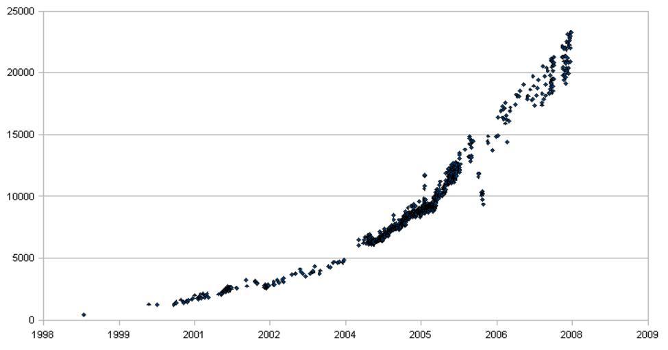 Keywords: ShoutcastServerGrowth.png en wikipedia 2012 July 16 Growth in number of servers available at shoutcast com from April 17 1999 to February 14 2008 The data source is self-reported statistics on shoutcast com's front page collected using the Internet Archive's Wayback Machine at http //web archive org/web/ /http //shoutcast com This work is entirely my own built using Openoffice org Calc and Draw I relinquish any and all copyright claims I might have releasing the work into the public domain Data file in CSV format <pre> Date Listeners Servers 4/17/1999 1367 410 4/18/1999 1315 436 6/21/2000 8633 1268 8/15/2000 4206 1217 8/15/2000 8397 1233 12/3/2000 3850 1250 12/5/2000 9004 1348 12/16/2000 5180 1449 12/19/2000 5076 1370 1/19/2001 11904 1642 2/2/2001 7297 1501 2/5/2001 5903 1411 2/24/2001 6705 1524 3/1/2001 5861 1467 3/2/2001 6434 1461 3/8/2001 13622 1599 3/31/2001 7476 1684 4/5/2001 8265 1755 4/18/2001 17401 2009 5/7/2001 7319 1722 5/13/2001 7063 1702 5/15/2001 16761 1817 5/19/2001 8891 1743 5/20/2001 8604 1821 5/22/2001 9528 1861 5/22/2001 9528 1861 5/28/2001 11578 2053 5/29/2001 8263 1837 5/31/2001 10288 1826 5/31/2001 18858 1842 6/2/2001 7639 1785 6/15/2001 17513 2115 6/21/2001 21852 2038 6/27/2001 17456 1958 6/27/2001 17855 1845 6/29/2001 20962 1989 7/10/2001 18617 2140 7/13/2001 10899 1912 7/20/2001 11454 1836 9/26/2001 13448 2086 10/9/2001 15034 2138 10/10/2001 15735 2146 10/11/2001 17653 2159 10/12/2001 15840 2173 10/13/2001 11645 2077 10/14/2001 11063 2067 10/15/2001 12808 2102 10/23/2001 25519 2272 10/24/2001 23725 2255 10/25/2001 24516 2274 10/26/2001 23463 2333 10/27/2001 13794 2250 10/30/2001 29106 2399 10/31/2001 29206 2349 11/1/2001 20323 2289 11/2/2001 12376 2311 11/2/2001 23313 2308 11/3/2001 16137 2335 11/4/2001 13528 2317 11/4/2001 13879 2475 11/5/2001 13699 2309 11/5/2001 20524 2329 11/6/2001 16829 2330 11/6/2001 30378 2457 11/6/2001 30544 2393 11/7/2001 18729 2335 11/7/2001 20337 2366 11/9/2001 16794 2385 11/9/2001 30322 2483 11/10/2001 17071 2432 11/10/2001 17071 2432 11/11/2001 13999 2397 11/12/2001 13764 2256 11/12/2001 20414 2303 11/13/2001 29841 2423 11/13/2001 29200 2440 11/14/2001 18257 2345 11/14/2001 24834 2352 11/15/2001 21738 2345 11/17/2001 15450 2434 11/19/2001 31114 2527 11/20/2001 18609 2428 11/21/2001 17392 2400 11/21/2001 13610 2435 11/22/2001 15670 2450 11/22/2001 14596 2469 11/24/2001 14357 2420 11/24/2001 14425 2712 11/25/2001 13587 2557 11/26/2001 21816 2480 11/29/2001 19448 2546 12/1/2001 10961 2546 12/1/2001 15235 2443 12/2/2001 10280 2447 12/2/2001 15471 2369 12/3/2001 29051 2466 12/4/2001 32109 2533 12/5/2001 32098 2546 12/6/2001 32699 2625 12/7/2001 27273 2615 12/8/2001 18242 2551 12/9/2001 16681 2440 12/10/2001 31512 2596 12/11/2001 17400 2543 12/12/2001 17787 2533 12/13/2001 21271 2601 12/14/2001 19281 2614 12/15/2001 17169 2621 12/16/2001 15387 2530 12/17/2001 34606 2613 1/20/2002 17663 2611 1/24/2002 16606 2593 3/26/2002 22440 3231 4/2/2002 23160 2752 5/24/2002 45271 3146 5/25/2002 25233 3092 5/28/2002 37725 3029 6/4/2002 24655 3000 6/6/2002 20678 2921 7/21/2002 21736 2755 7/26/2002 21120 2662 8/2/2002 39931 2842 8/3/2002 15874 2624 8/4/2002 15419 2584 8/5/2002 21997 2609 8/7/2002 24585 2756 8/8/2002 20744 2742 8/8/2002 23465 2732 8/9/2002 25496 2773 8/10/2002 18323 2759 8/11/2002 19220 2681 8/13/2002 24627 2740 8/13/2002 22817 2719 8/14/2002 30210 2797 8/15/2002 22176 2761 8/16/2002 31592 2851 8/22/2002 20431 2786 9/23/2002 31477 2829 9/25/2002 51319 3089 9/28/2002 20462 2850 9/30/2002 22881 2850 10/17/2002 46049 3252 10/28/2002 21910 3020 11/21/2002 28013 3177 11/22/2002 36797 3288 11/24/2002 25888 3294 11/29/2002 31515 3401 12/1/2002 21428 3104 1/22/2003 60426 3659 2/17/2003 52815 3783 2/18/2003 34776 3714 3/19/2003 59817 4093 3/23/2003 28691 3918 4/4/2003 35169 3756 4/22/2003 33302 3529 5/25/2003 18574 3742 6/11/2003 36541 3854 6/12/2003 39430 3883 6/12/2003 51022 3978 6/23/2003 61312 4317 7/26/2003 32622 3749 7/29/2003 56696 4007 9/19/2003 74377 4360 10/5/2003 34060 4252 10/24/2003 73531 4641 10/28/2003 88804 4676 11/20/2003 48789 4620 12/4/2003 46259 4721 12/25/2003 36392 4646 12/30/2003 50202 4704 1/1/2004 39402 4881 4/7/2004 128863 6496 4/11/2004 56199 6070 5/9/2004 61639 6223 5/13/2004 98383 6473 5/19/2004 139798 6739 5/26/2004 71073 6170 6/5/2004 88934 6696 6/6/2004 70347 6506 6/9/2004 86097 6253 6/10/2004 71709 6272 6/10/2004 132417 6727 6/11/2004 134012 6867 6/12/2004 75283 6422 6/14/2004 123395 6598 6/14/2004 131475 6712 6/15/2004 62380 6177 6/15/2004 74649 6172 6/16/2004 75481 6140 6/16/2004 135806 6649 6/18/2004 72640 6299 6/18/2004 133807 6965 6/19/2004 70140 6554 6/19/2004 62846 6264 6/21/2004 108698 6658 6/22/2004 70166 6396 6/22/2004 77081 6369 6/22/2004 143941 6943 6/23/2004 72696 6393 6/23/2004 82796 6383 6/24/2004 138699 6795 6/26/2004 51969 6310 6/26/2004 59117 6335 6/26/2004 62977 6392 6/27/2004 48767 6149 6/27/2004 52285 6177 6/28/2004 59731 6252 6/28/2004 67223 6193 6/29/2004 72640 6183 6/30/2004 79265 6216 6/30/2004 132880 6678 7/1/2004 74497 6164 7/1/2004 86750 6368 7/1/2004 130309 6693 7/1/2004 103760 6551 7/2/2004 94443 6683 7/3/2004 59586 6373 7/3/2004 54244 6237 7/4/2004 44353 6223 7/4/2004 46654 6187 7/5/2004 47826 6225 7/5/2004 64928 6125 7/6/2004 60927 6317 7/6/2004 67313 6168 7/7/2004 70134 6264 7/8/2004 62969 6227 7/10/2004 55929 6340 7/10/2004 58683 6263 7/10/2004 64627 6391 7/10/2004 75451 6667 7/11/2004 53419 6254 7/11/2004 54923 6155 7/12/2004 55321 6218 7/12/2004 69209 6249 7/13/2004 70396 6330 7/13/2004 66197 6135 7/14/2004 56047 6280 7/14/2004 70382 6243 7/15/2004 60394 6184 7/15/2004 77410 6173 7/16/2004 63082 6325 7/16/2004 72269 6204 7/17/2004 56885 6383 7/17/2004 56441 6328 7/18/2004 49600 6156 7/18/2004 48936 6098 7/19/2004 61502 6252 7/19/2004 64181 6188 7/20/2004 72327 6385 7/20/2004 65444 6197 7/21/2004 70139 6398 7/21/2004 73078 6290 7/22/2004 71014 6480 7/22/2004 71892 6378 7/24/2004 55532 6354 7/24/2004 60037 6368 7/25/2004 53881 6339 7/26/2004 60485 6338 7/26/2004 72358 6316 