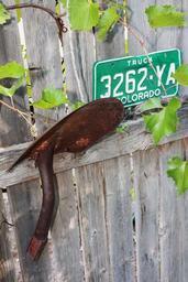Keywords: shovel license plate garden yard art outdoor art vine nature summer design gardening landscape wooden fence creative decoration