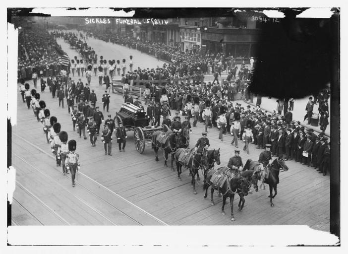 | Keywords: Sickles funeral, 5-8-14 (LOC).jpg Bain News Service publisher Daniel Sickles funeral 5/8/14 The Old Guard of the City of New York serves as the honor guard 1 negative glass ; 5 x 7 in or smaller Notes Title from unverified data provided by the Bain News Service on the negatives or caption cards Forms part of George Grantham Bain Collection Library of Congress Format Glass negatives Rights Info No known restrictions on publication Repository Library of Congress Prints and Photographs Division Washington D C 20540 USA http //hdl loc gov/loc pnp/pp print hdl loc gov/loc pnp/pp print General information about the Bain Collection is available at http //hdl loc gov/loc pnp/pp ggbain hdl loc gov/loc pnp/pp ggbain Persistent URL http //hdl loc gov/loc pnp/ggbain 16199 hdl loc gov/loc pnp/ggbain 16199 Call Number LC-B2- 3084-12 http //www flickr com/photos/library_of_congress/5517542750/ Sickles funeral 5/8/14 LOC LOC-image ggbain 16199 1914-05-08 Bain News Service http //www loc gov/rr/print/195_copr html noknown The Library of Congress Flickr Commons PD-Bain Leoboudv 2012-02-25 Broadway Daniel Sickles 1914 in New York City |