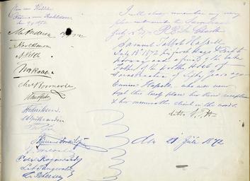 | Keywords: sarabråten østmarka gjestebok hyttebok gjester signatur signaturer navnetrekk signature thomas joh. heftye thomasjohheftye thomas johannessen heftye thomasjohannessenheftye thomas j. heftye thomasjheftye thomas heftye thomasheftye heftye document text writing drawing sketch whiteboard texture Hilsner fra bl a Du Chaillu, Paul Belloni (1835 – 1903). Amerikansk oppdagelsesreisende. Skrev bl.a. reiseskildringer fra Norge og Sarabråten. Og Samuel Talbot Hassell (1797 - 1882) Britisk adelsmann fra Yorkshir. Med kone. Hilsner fra bl a Du Chaillu, Paul Belloni (1835 – 1903). Amerikansk oppdagelsesreisende. Skrev bl.a. reiseskildringer fra Norge og Sarabråten. Og Samuel Talbot Hassell (1797 - 1882) Britisk adelsmann fra Yorkshir. Med kone. |