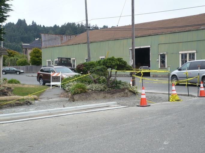 Keywords: SidewalkConstruction.jpg en A view facing south west at the corner of Rose and Berding Streets in Ferndale California showing a curb excavation and finished poured sidewalk curbing The corner was excavated and left open and unsecured other than by caution tape for 14 days before the curbing was poured It is still open on the date of this upload own Ellin Beltz 2014-06-02 Ferndale California Sidewalks in CaliforniaPhotographs by Ellin Beltz |