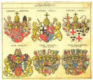 | Keywords: Siebmacher003.jpg Johann Siebmacher New Wappenbuch Die Churfürsten Blatt 3 eingescannt aus Horst Appuhn Hrsg Johann Siebmachers Wappenbuch Die bibliophilen Taschenbücher 538 2 verb Aufl Dortmund 1989 1605 Creator Johann Siebmacher PD-old-100 Chur Brandeburg jpg Chur Sachsen jpg Ertzbis Coln jpg Siebmacher - Kurfuersten Ernst von Bayern Johann Schweikhard von Kronberg Lothar von Metternich Coats of arms of archbishops of the Roman Catholic Archdiocese of Cologne Coats of arms of archbishops of the Roman Catholic Diocese of Mainz Coats of arms of archbishops of the Roman Catholic Diocese of Trier Derivatives of the Coat of arms of Cologne archdiocese Derivatives of the Coat of arms of Kronberg family Derivatives of the Coat of arms of Mainz diocese Derivatives of the Coat of arms of Metternich family Derivatives of the Coat of arms of Trier diocese |