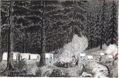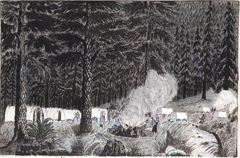 Keywords: Sierra-Nevada-Mountain-Camp-Jenks.jpeg Mountain camp Siera sic Nevada Drawing shows a camp in the heart of a forest of tall pines Covered wagons rest their wheels nearly hidden by tall grass in the clearing Men and women cook over a large open fire near a stream in the Sierra Nevada Mountains having left Susanville California that morning on Saturday August 13 1859 and made camp here MEDIUM 1 drawing on paper graphite ink and crayon ; 17 7 × 25 3 cm sheet Library of Congress Prints Photographs Division LC-DIG-ppmsc-04820 digital image from original http //memory loc gov/master/pnp/ppmsc/04800/04820u tif archival TIFF version 15 MiB color level pick white and black point cropped and converted to JPEG with the GIMP 2 6 6 image quality 88 1859-08-13 Daniel A Jenks 1827 “1869 No known restrictions on publication LOC-image ppmsc 04820 PD-old American drawing Campsites in art Covered wagons in art Sierra Nevada of North America in art Daniel A Jenks Wagon trains 1859 in California |