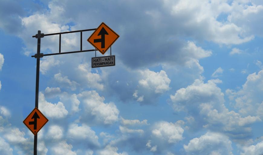 Keywords: sign plank street road yellow way be careful sky high cross road indonesia