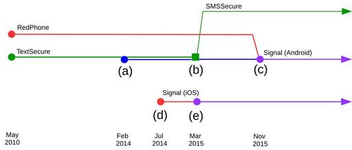 Keywords: Signal timeline.svg Signal Sources TextSecure and Signal Android apps are above and iOS app is below Events <br/> a Open Whisper Systems updated their protocol to version 2 adding group chat and instant messaging capabilities <br/> b Open Whisper Systems ended support for encrypted SMS/MMS messaging on Android This prompted some users to create a fork which is named SMSSecure and is meant solely for encrypted SMS/MMS messaging <br/> c Open Whisper Systems merged RedPhone into TextSecure and renamed it as Signal <br/> d Open Whisper Systems launched Signal as a RedPhone counterpart for iOS <br/> e Open Whisper Systems added support for encrypted group chat and instant messaging Colours legend FF0000 Red Encrypted voice calling capabilities 00DA34 Green Encrypted SMS/MMS messaging capabilities in TextSecure and subsequently in SMSSecure a third-party fork of TextSecure 4200FF Blue Encrypted group chat and instant messaging capabilities B000FF Purple Signal for Android and iOS after both had encrypted group chat instant messaging and voice calling capabilities 2016-03-30 own Dodi 8238 other versions cc-zero Open Whisper Systems |