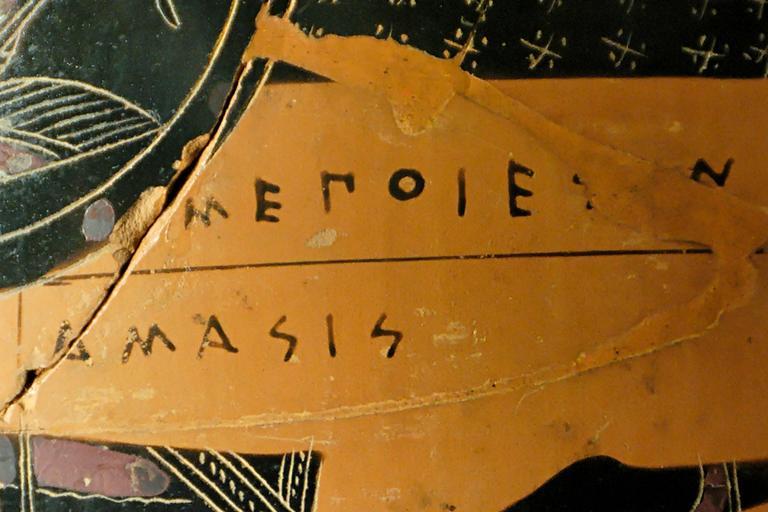 Keywords: Signature Amasis Louvre F30.jpg Amasis' signature ΑΠΑΣΙΣ ΠΕΠΟΙΕΣΕΠrotated 90° anticlockwise detail from a scene representing Herakles entering Olympus Attic black-figure olpe 550 “530 BC Signature d'Amasis ΑΠΑΣΙΣ ΠΕΠΟΙΕΣΕΠtourné à 90° dans le sens inverse des aiguilles d'une montre détail d'une scène représentant l'entrée d'Héraclès dans l'Olympe Olpè attique à figures noires du potier Amasis signature et du Peintre d'Amasis 550-530 av J -C H 26 4 cm 10 ¼ in Diam 13 5 cm 5 ¼ in Museum Louvre Department of Greek Etruscan and Roman antiquities in the Louvre Sully first floor room 42 case 4 object history credit line Purchase 1880 accession number F 30 Jastrow 2007 other versions <gallery> Image Herakles Olympos Louvre F30 full jpg Full view of the vase </gallery> Signatures in ancient Greek pottery Amasis Painter Ancient Greek olpai Greek antiquities in the Louvre - Room 42 6th-century BC pottery |