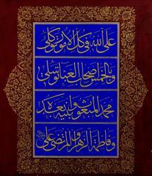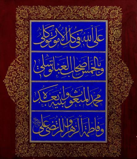 Keywords: Signed Mahmud Celaleddin - Levha (calligraphic inscription) - Google Art Project (591903).jpg Arabic text reads على الله في كل الأمور توكلى وبالخمس أصحاب العباء توسلى محمد المبعوث وابنيه بعده وفاطمة الزهراء والمرتضى على 1750 Signed 591902 Mahmud Celaleddin 1750 /collection/sakp-sabanc-museum/artwork/levha-calligraphic-inscription-signed-mahmud-celaleddin/591903/ Signed Mahmud Celaleddin /artist/mahmud-celaleddin/4126481/ 4126481 /collection/sakp-sabanc-museum/ Sakıp Sabancı Museum 479109 http //muze sabanciuniv edu/ 12/28/2011 6 21 37 PM /collection/sakp-sabanc-museum/artwork/levha-calligraphic-inscription-signed-mahmud-celaleddin/591903/ 1800 1800 635 591903 False 1800 3/24/2012 6 39 50 AM 130-0100-MC Sakıp Sabancı Museum Gold on paper 1800 1810 w550 x h635 mm 1800 False 0 861328125 Sakıp Sabancı Museum Object levha-calligraphic-inscription-signed-mahmud-celaleddin Levha calligraphic inscription l 550 special url_id dgGsk_3htnjtEw PD-old-100 Google Art Project works by Mahmud Celaleddin Calligraphy in Turkey