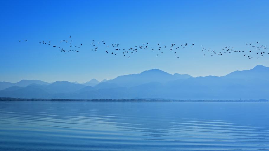Keywords: silhouette landscape chiemsee sky mountains migratory birds water bavaria clouds blue lake upper bavaria distant nature foresight mood land waters view distant view abendstimmung morgenstimmung romantic atmosphere twilight mirroring
