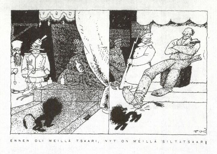 | Keywords: Siltatsaari.jpg en Before we had the czar now we have the Siltatsaari Silta-czar ; right-wing caricaturist Topi Vikstedt thought that the left wing of labour movement which had its headquarters in Helsinki's Siltasaari had replaced the Russian czar as the main opressor of Finland “ and was possibly worse Published in Finnish humour magazine Kerberos fi Oikeiston näkemystä edustavassa Topi Vikstedtin pilakuvassa työväenliikkeen siltasaarelaiset ovat korvanneet tsaarin Suomen sortajina “ ollen mahdollisesti vielä pahempia Julkaistu Kerberos-pilalehden joulunumerossa 1917-12 Marja Ylönen Pilahistoria Suomi poliittisissa pilapiirroksissa 1800-luvulta 2000-luvulle SKS Helsinki 2001; s 146 Topi Vikstedt 1891 “1930 PD-old Uploaded with UploadWizard Caricatures of Finland Political history of Finland Topi Vikstedt |