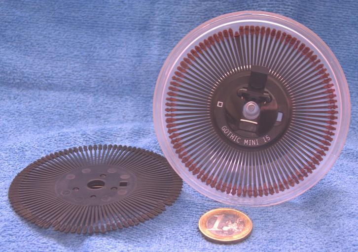 | Keywords: Silver-Reed Daisywheel Wiki.jpg Daisywheel system Silver-Reed front and back side open clip 15 cpi sample in box plus one Euro coin to compare size Own 2006-08-20 de hd free public domain Details of typewriters Daisy wheel printers Images with coins to indicate scale |
