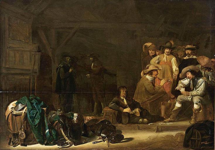 | Keywords: Simon Kick - Soldiers in a Barn - WGA12186.jpg Artwork Creator Simon Kick other date firsthalf other date century 17 Oil on panel size cm 75 105 Private collection accession number object history credit line WGA link 12186 http //www wga hu/art/k/kick/simon/soldiers jpg http //www wga hu/html/k/kick/simon/soldiers html PD-old-100 painting genre Dutch 1601-1650 Simon Kick Paintings in unidentified private collections 17th-century oil on canvas paintings WGA form painting WGA type genre WGA School Dutch WGA time period 1601-1650 17th-century way of life in painting 17th-century military life Interiors of barns in art 1601-1650 paintings in private collections Card games in art Men in rooms in art |