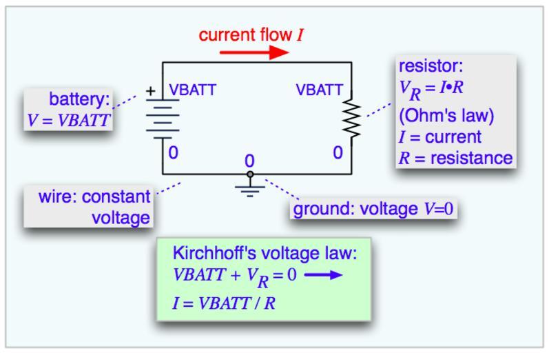 Keywords: Simple electrical schematic with Ohms law.png en A simple schematic diagram with a battery and a resistor showing the use of Ohm's law and Kirchhoff's voltage law to find the current Own Danield101 2010-03-08 Circuit analysis Ohm's law