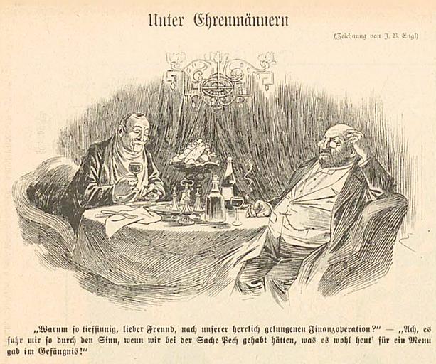 Keywords: Simplicissimus Unter Ehrenmännern.png title de Unter Ehrenmännern žWarum so tiefsinnig lieber Freund nach unserer herrlich gelungenen Finanzoperation “ žAch es fuhr mir so durch den Sinn wenn wir bei der Sache Pech gehabt hätten was es wohl heut' für ein Menu gab im Gefängnis Simplicissimus 6 Jahrgang Nr 43 S 342 http //simplicissimus info/booklet/464 Creator Josef Benedikt Engl 1902 Josef Benedikt Engl Simplicissimus Caricatures of Germany 1902 cartoons Restaurants in art PD-old-100 |