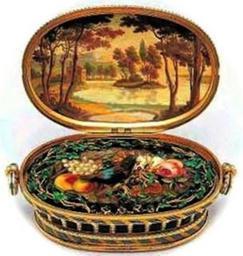 | Keywords: Singing bird box by Jacob Frisard, ca. 1800.jpg en Swiss split-pearl set and enamelled gold bird box by Jacob Frisard 1753-1812 Geneva circa 1800 Oval case in the form of a basket the base enamelled with a bouquet of peonies and other spring flowers bordered by split-pearls and with split-pearls radiating over a blue guilloché ground opening to form a shallow box the walls similarly decorated with pearls and enamel between reed-and-tie champlevé borders the domed lid likewise decorated and with a plaque depicting fruit with two independent split-pearl set ring handles the interior with a bird seated on a sculpted berried gold spray over painted further fruit and flowers bordered by a sculpted and green enamelled gold wreath of ivy the interior of the lid painted with a lakeside landscape the centre of the rear side with a string with pearl finial when pulled releasing the mechanism of the colourfully plumed bird flapping its wings moving its tail and opening its beak 86 mm wide own Jafd88 2013 Singing Bird Box Gold boxes Cc-zero |