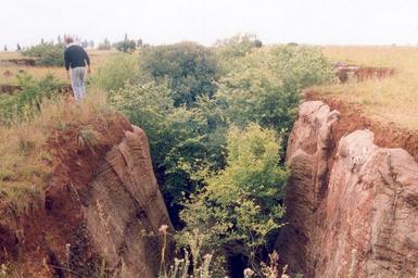 | Keywords: Sinkholeingrykecarletonville.jpg en Sinkhole in slot gryke within a shallow dolomite environment The sinkholes were generated subsequent to flash flooding in the 1980's north of Careletonville in Gauteng Province South Africa own Nicole Trollip 1999-02-01 -26 292116_27 371031_region ZA Sinkholes Gauteng |