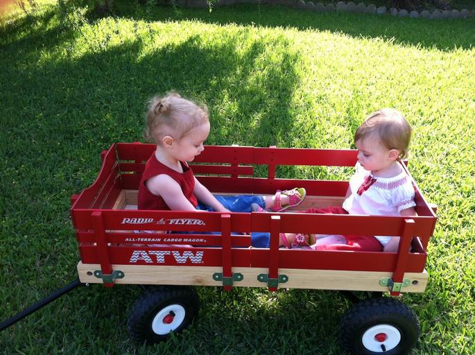 Keywords: sister wagon play outdoors fun red children together little two recreation