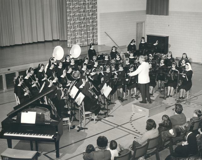 Keywords: London, Ontario. The Sisters of St. Joseph Concert Band began as part of the Centennial Program for the London based Sisters, which lasted from December 1968 until December 1969. However, the Concert Band lasted well beyond the Centennial year, and was quite successful, playing at ecumenical concerts, music festivals, and performance venues from Quebec City to Edmonton and many places in between. From March 1968 to June 1970, the Sisters of St. Joseph Concert Band performed in 15 cities, at 35 public concerts, traveled 8,000 miles and performed for over 23,000 people. Its conductor was the well-known and respected Mr. Martin Boundy, until 1971 when Mr. Donald H. Jones became the Band's conductor. The instruments first arrived on March 17, 1967, and the Sisters began practicing. Their first concert was on March 19 (St. Joseph's Day) in the Mount St. Joseph Academy Auditorium in London, Ontario. The Concert Band first officially performed at Catholic Central High School on March 15, 1968. On October 1 of the same year, they played at the Kiwanis Convention on the ground floor of Centennial Hall in London. Another significant performance included the 1968 Waterloo Instrumental Clinic on April 27, 1968, when they laid down their instruments and performed as a choir and received a standing ovation from their audience. Photo credit: Victor Aziz music bands concerts londonont sistersofstjoseph