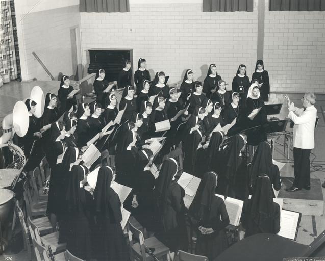Keywords: London, Ontario. The Sisters of St. Joseph Concert Band began as part of the Centennial Program for the London based Sisters, which lasted from December 1968 until December 1969. However, the Concert Band lasted well beyond the Centennial year, and was quite successful, playing at ecumenical concerts, music festivals, and performance venues from Quebec City to Edmonton and many places in between. From March 1968 to June 1970, the Sisters of St. Joseph Concert Band performed in 15 cities, at 35 public concerts, traveled 8,000 miles and performed for over 23,000 people. Its conductor was the well-known and respected Mr. Martin Boundy, until 1971 when Mr. Donald H. Jones became the Band's conductor. The instruments first arrived on March 17, 1967, and the Sisters began practicing. Their first concert was on March 19 (St. Joseph's Day) in the Mount St. Joseph Academy Auditorium in London, Ontario. The Concert Band first officially performed at Catholic Central High School on March 15, 1968. On October 1 of the same year, they played at the Kiwanis Convention on the ground floor of Centennial Hall in London. Another significant performance included the 1968 Waterloo Instrumental Clinic on April 27, 1968, when they laid down their instruments and performed as a choir and received a standing ovation from their audience. Photo credit: Victor Aziz music bands concerts londonont sistersofstjoseph