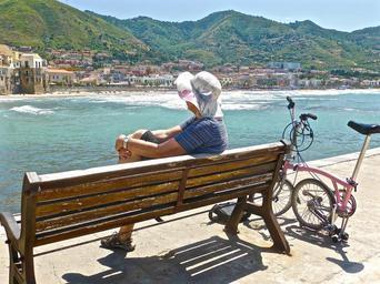Keywords: sitting view female looking seaside outlook contemplation
