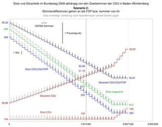 | Keywords: Sitze und Sitzanteile im Bundestag 2009 abhängig von den Zweitstimmen der CDU in Baden-Württemberg – Szenario 2.svg de Darstellung des hypothetischen Ergebnis der Bundestagswahl 2009 wenn die CDU in Baden-Württemberg weniger oder mehr Zweitstimmen bekommen hätte Szenario 2 Stimmendifferenzen gehen an die FDP bzw kommen von ihr so dass die Summe von CDU und FDP konstant bleibt Bei einem Patt werden halbe Sitze verteilt die im Fall der Oberverteilung in der Unterverteilung an das Land mit dem höchsten unerfüllten Sitzanspruch gehen nächste Höchstzahl bei Sainte-Laguë höchster verbleibender Bruchteil bei Hare/Niemeyer Kontext Negatives Stimmengewicht own …¡ …¦ …« 2010-01-15 File Sitze und Sitzanteile im Bundestag 2009 abhängig von den Zweitstimmen der CDU in Baden-Württemberg “ Szenario 1 svg File Sitze und Sitzanteile im Bundestag 2009 abhängig von den Zweitstimmen der CDU in Baden-Württemberg “ Szenario 3 svg Voting systems Bundestag elections |
