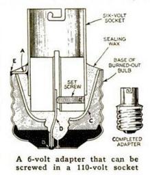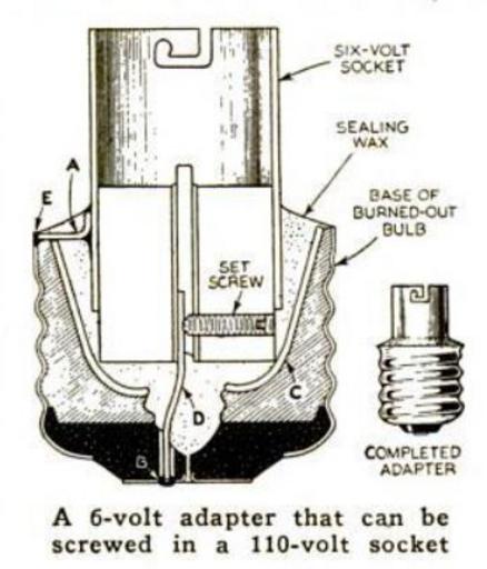 | Keywords: cartoon drawing sketch Popular Science July 1937 Socket Adopter. A. P. Fletcher won a prize with a homemade socket adapter that enables both 6- and 110-volt bulbs to be used in the 100-volt electric sockets so that the trailer needs only one set of wining for city electric current and storage battery current from the car. The base of a burned-out bulb, a battery bulb socket, two short pieces of 13-gauge bare copper wire, sealing wax, and solder are the materials needed. Break away all the glass from the base except the lower part C, which is held by sealing wax. Drill a clip_image002[3]_thumb -in. diameter hole B through the contact disk, off center about ⅛ in. so that the curled flanges which hold the disk in place are not cut away. Secure the center wire D in place by the set screw of the 6-volt bulb socket, and solder the wire A to the outer shell. Place the socket into the screw base as nearly central as possible, and solder the wires at B and E. Warm the entire assembly and pour sealing was into the space between the 6-volt socket and the screw base. haw-creek.com/improved-trailer-fittings-make-life-on-whee... Popular Science July 1937 Socket Adopter. A. P. Fletcher won a prize with a homemade socket adapter that enables both 6- and 110-volt bulbs to be used in the 100-volt electric sockets so that the trailer needs only one set of wining for city electric current and storage battery current from the car. The base of a burned-out bulb, a battery bulb socket, two short pieces of 13-gauge bare copper wire, sealing wax, and solder are the materials needed. Break away all the glass from the base except the lower part C, which is held by sealing wax. Drill a clip_image002[3]_thumb -in. diameter hole B through the contact disk, off center about ⅛ in. so that the curled flanges which hold the disk in place are not cut away. Secure the center wire D in place by the set screw of the 6-volt bulb socket, and solder the wire A to the outer shell. Place the socket into the screw base as nearly central as possible, and solder the wires at B and E. Warm the entire assembly and pour sealing was into the space between the 6-volt socket and the screw base. haw-creek.com/improved-trailer-fittings-make-life-on-whee... |