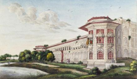 Keywords: Sixty drawings of Mughal monuments and architectural details Qudsiya Bagh 1836.jpg A corner of the Qadsiyah Palace in Delhi is shown on the bank of the River Jumna From Sixty drawings of Mughal monuments and architectural details The drawings are recorded as being by 'native' droughtsmen of the Delhi School in the Office of the Honourable East India Company's Superintendent of Public Buildings and Ancient Monuments at Calcutta ca 1836 These set of drawings are of Mughal monuments in the Delhi area in a landscape setting They are almost identical to a set collected in Delhi by Sir Thomas Metcalfe ca 1840 some of which were by Mazar Ali Khan and published in Kaye 1980 Materials and Techniques Watercolour on paper Credit Line Given by E H Hindley Victoria and Albert Museum number IM 22-1923 http //collections vam ac uk/item/O15731/sixty-drawings-of-mughal-monuments-architectural-drawing-unknown/ ~ 1836 author PD-art-100 Qudsia Bagh Mughal art in the Victoria and Albert Museum |