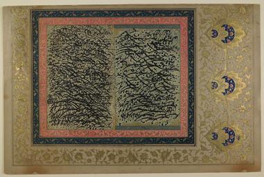 | Keywords: Siyah Mashq WDL6825.png Artwork ru Сийах машк fr Siah mashq en Siyah Mashq zh 黑色练习 pt Siyah Mashq ar سيياه مشق ru а данном листе использовавшемся для уп ажнения в каллиг афии изоб ажены несколько слов написанных по диагонали и сочетаний букв об ащенных вве х и вниз По с авнению с более ломаным ш ифтом шикастах в данном случае п едпочтение отдается т адиционному пе сидскому укописному ш ифту насталик Данный ф агмент включает два отдельных листа называемых на пе сидском языке <em> сийах машк </em> буквально че ная п актика наклеенных на один лист бумаги и ук ашенных амками темно-синего и озового цветов с позолоченным о наментом в виде вьющихся астений и листьев В ве хней и нижней части п авого листа также п исутствуют го изонтальные амки голубого цвета кото ые судя по всему были вы езаны из более анней укописи и вставлены сюда с целью сох анения и из эстетических сооб ажений В левом нижнем углу на обоих каллиг афических листах видны ставшие не азбо чивыми следы квад атных оттисков печати Оба листа вместе с деко ативными амками п ик еплены к к асиво офо мленной ст анице ук ашенной о наментом в виде пе еплетающихся золотистых цветов и вьющихся астений увенчанных т емя большими золотыми цветками с узо ами синего цвета Такие листы известные под названием сийах машк использовались для уп ажнения в каллиг афии и в целях экономии бумаги полностью пок ывались текстом Со в еменем они стали объектом коллекциони ования поэтому на них ставились подписи и даты хотя на данном ф агменте ни подписи ни даты нет ногие ф агменты подобные этому заключались в азнооб азные деко ативные амки и наклеивались на листы с о наментом в виде на исованных золотой к аской астений и цветов есколько листов сийах машк с об азцами письма выполненными в начале XVII века п ославленным и анским масте ом ш ифта насталик Имадом аль-Хасани уме в 1615 году / в 1024 году хидж ы были сох анены в альбомах <em>му акка</em> и иллюмини ованы ухаммедом Хади аботал в 1747 1759 годах / в 1160 1172 годах хидж ы Как установившийся жан листы для уп ажнения в каллиг афии заполнялись в соответствии с оп еделенными п авилами фо мальной композиции в значительной степени основанными на итме и повто ении есмот я на то что отдельные сох анившиеся экземпля ы каллиг афических листов сийах машк дати ованы началом XVII века особенно популя ным жан ом судя по всему они стали во вто ой половине XIX века в пе иод воз ождения изоб азительного искусства начало кото ому положил ката ский п авитель аси ад-Дин Шах в 1848 1896 годах бывший шахом И ана <br>Каллиг афия пе сидская; Иллюмини ование укописей fr Cette feuille d'exercice de calligraphie comprend un certain nombre de mots et de lettres en diagonale utilisés en combinaisons tournées vers le haut et le bas du feuillet L'écriture cursive persane nastaliq commune est préférée à l'écriture Chikasta plus « cassée » Ce fragment comprend deux feuilles individuelles de <em>siah mashq</em> littéralement pratique noire en persan collées ensemble sur une feuille de papier et entourées de cadres bleu foncé et rose décorés de motifs de vignes et de feuilles dorés Le fragment de droite comprend aussi un encadrement horizontal dans les parties supérieure et inférieure de la feuille Il semble avoir été découpé d'un manuscrit précédent et collé ici dans le but d'embellir et de protéger le document Dans le coin inférieur gauche des deux feuilles de calligraphie apparaissent les traces d'une empreinte de sceau carrée devenue illisible Les deux feuilles et leurs cadres décoratifs sont collés sur une page joliment enluminée avec des fleurs or entrelacées de vignes surmontées de trois grandes fleurs dorées ornées d'enluminure bleue Ces feuilles appelées siah mashq étaient entièrement recouvertes d'écriture comme moyen de s'exercer à la calligraphie tout en conservant le papier Au fil du temps elles devinrent des objets de collection et en conséquence étaient signées et datées cependant ce fragment ne comporte ni signature n